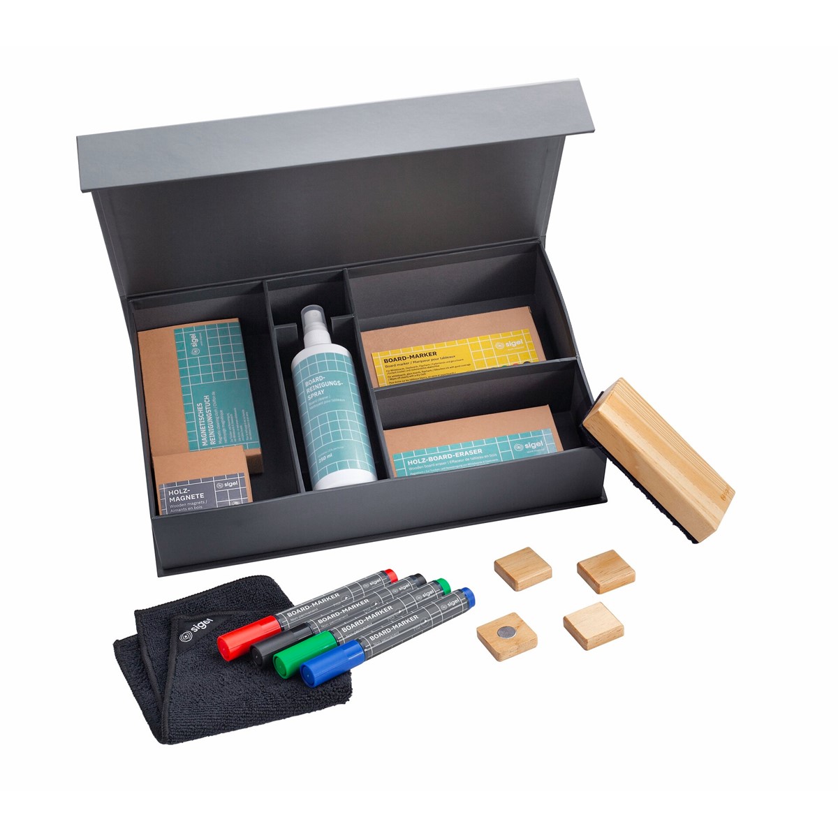 • Gratis Starterset (BA311): BA010 Board-Marker, BA211 Holz-Magnete quadratisch, BA120 Holz-Board-Eraser inkl. Ersatzpad, BA110 Magnetisches Reinigungstuch, BA140 Reinigungsspray. Unverzichtbar bei jedem Meeting, Seminar oder Workshop