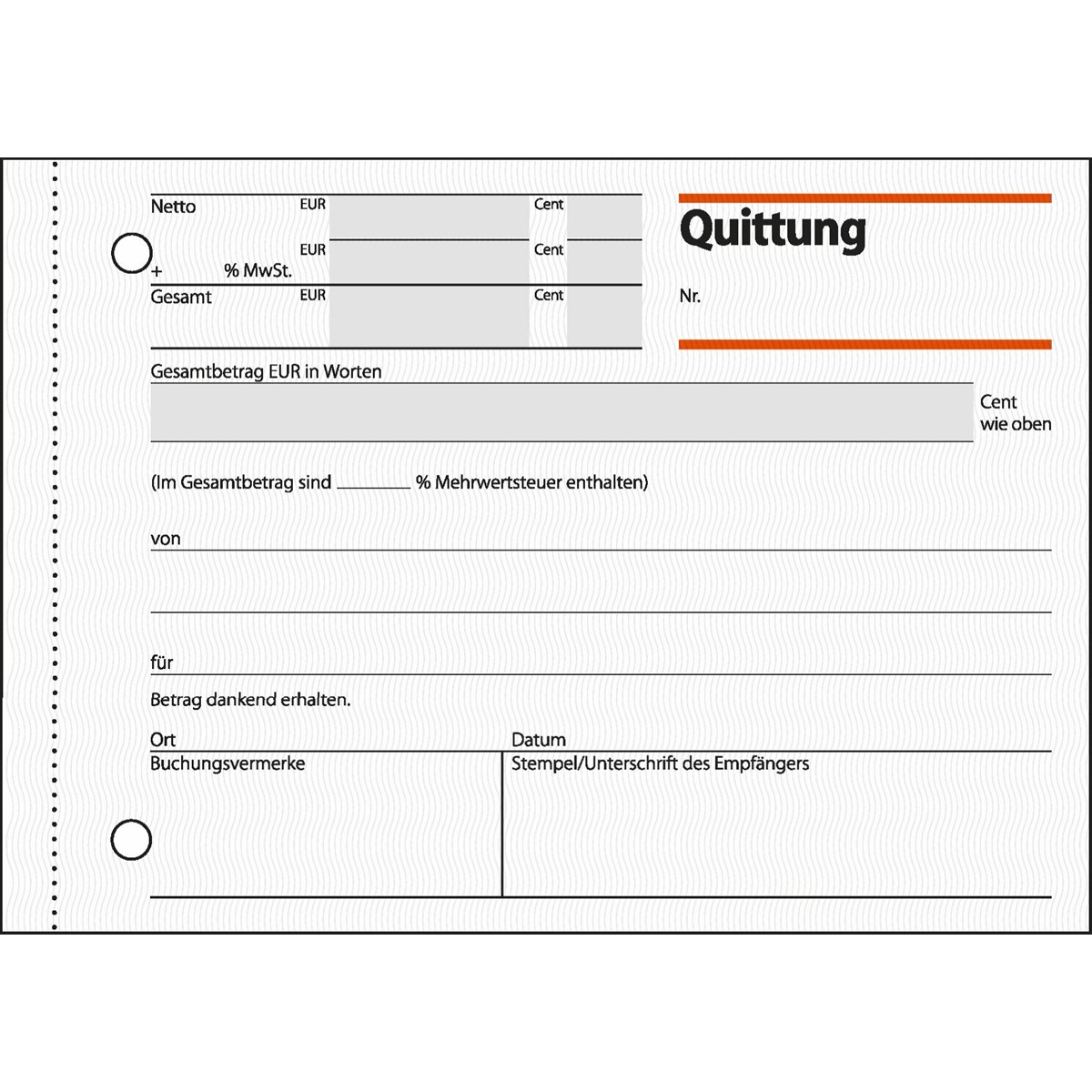 • Quittungs-Formular, Format A6 quer, mit MwSt.-Nachweis.