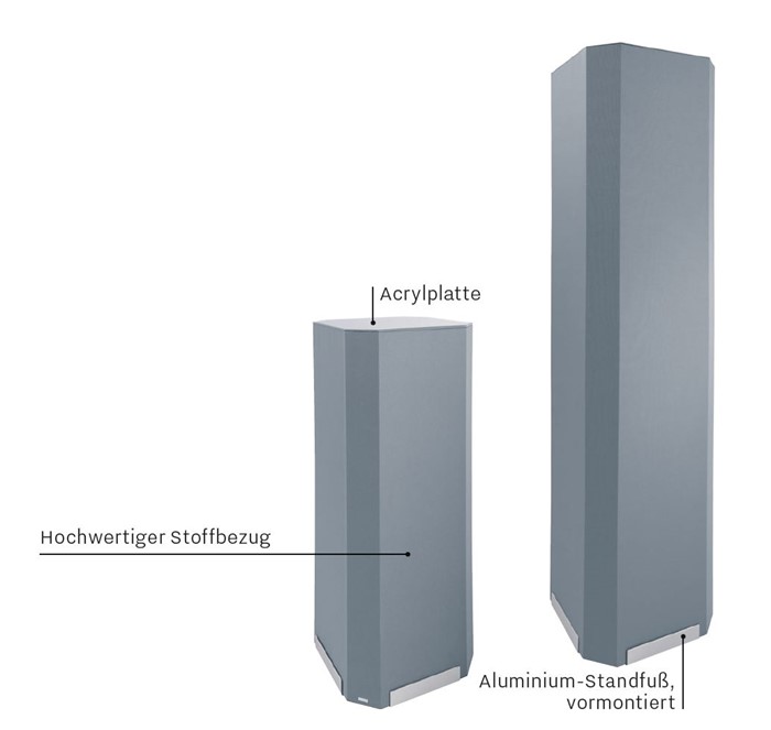 Akustisch wirksame Säule zur Optimierung der Raumakustik in Mehrpersonenbüros. Kern aus thermisch gepresstem Polyestervlies, unsichtbarer Aluminium-Konstruktionsrahmen, hochwertiger Stoffbespannung und vormontierter Standfuß aus matt eloxiertem Aluminium. Im kleinen Format zusätzlich mit obenliegender, transparenter Acrylplatte zur Nutzung als praktische Ablagefläche.