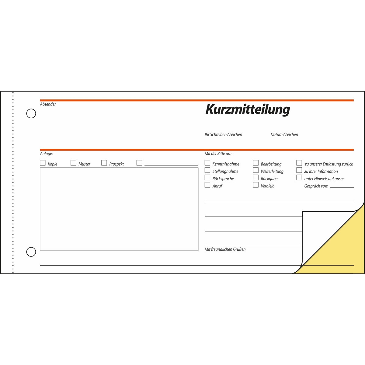 Selbstdurchschreibende Kurzmitteilung im Format 1/3 DIN A4 mit 40 Originalen + 40 gelben Kopien, inklusive integrierter Schreibunterlage, FSC® zertifiziert. Alle Blätter mit Abheftlochung und ultrafeiner Microperforation für ein schnelles und sauberes Heraustrennen. Das Anschriftenfeld ist passend für DIN lang Umschläge mit Fenster. Verschiede Bearbeitungshinweise sind auswählbar und müssen lediglich angekreuzt werden, Informationen oder Nachrichten können so schnell und prägnant weiter geleitet werden. Eine Sicherheitsbindung macht das Formularbuch besonders stabil und haltbar.