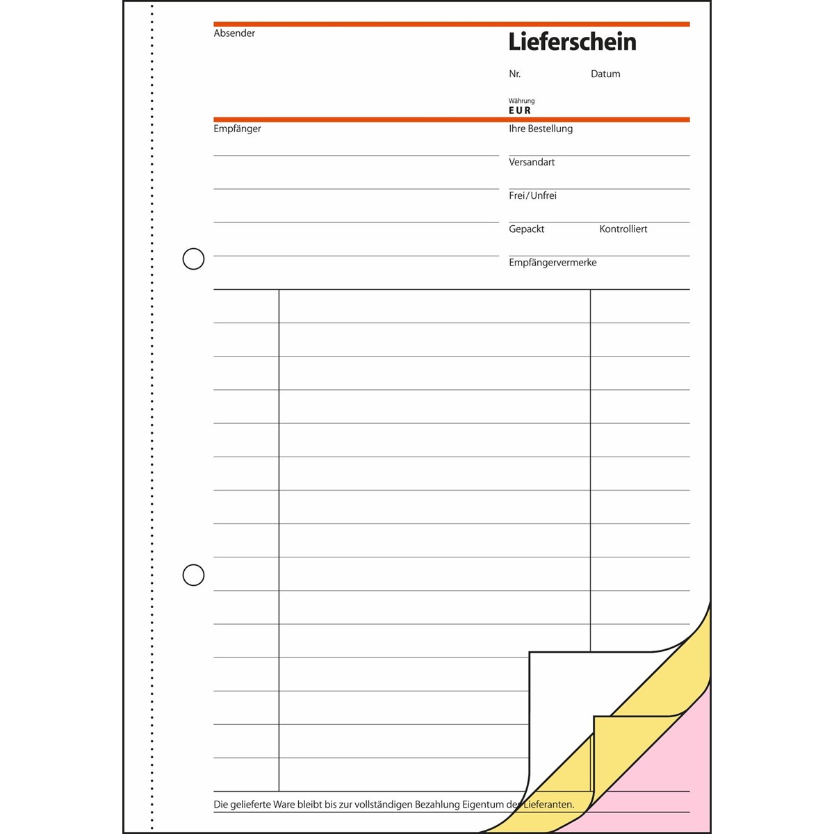 Selbstdurchschreibendes Lieferscheinbuch, Format A5, mit farbiger Kopie (rosa) und Empfangsschein (gelb) - alle Blätter bedruckt.