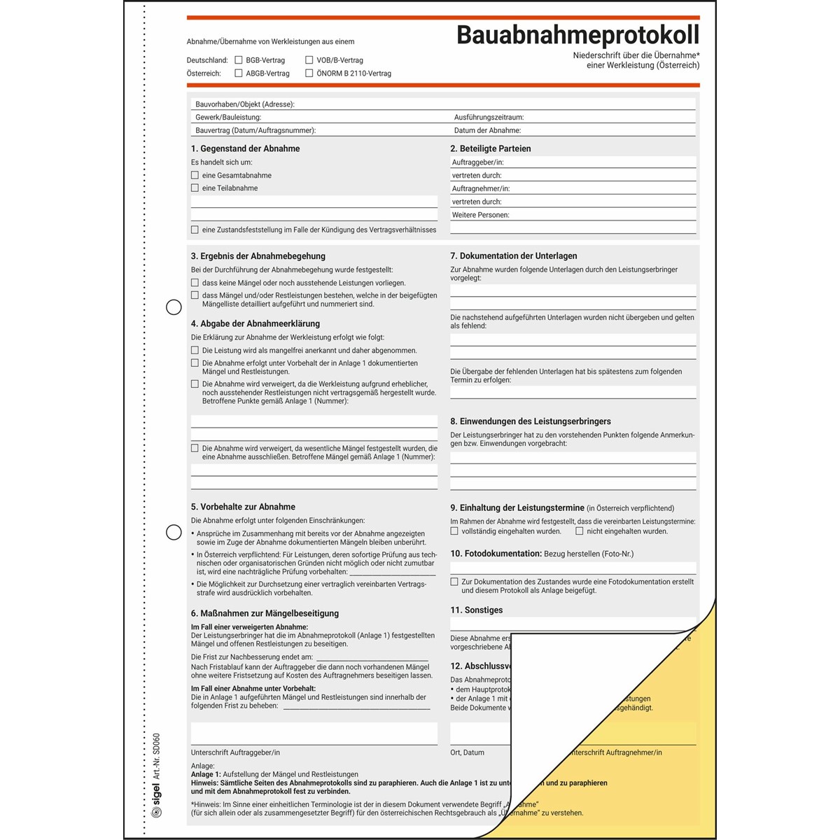 Teil 1: Bauabnahmeprotokoll mit allen relevanten Übergabeinfos von Handwerk zu Bauleiter; alle Blätter bedruckt, farbige Kopien zum Verbleib im Buch