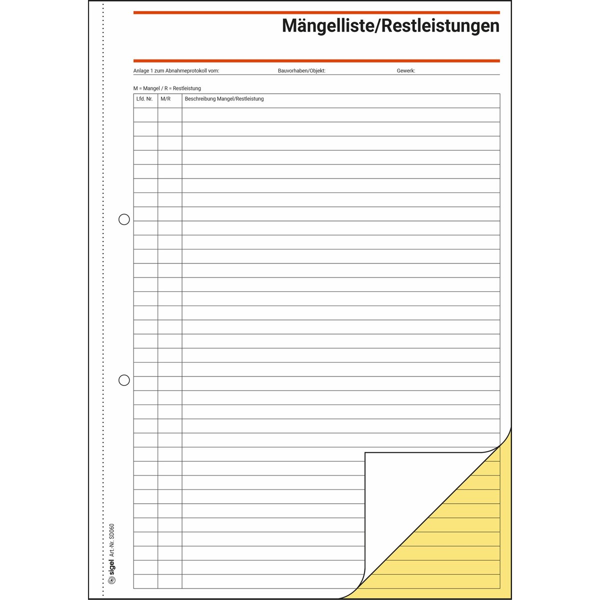 Teil 2: Mängelliste zur detaillierten Beschreibung von fehlerhaften Bauarbeiten; alle Blätter bedruckt, farbige Kopien zum Verbleib im Buch