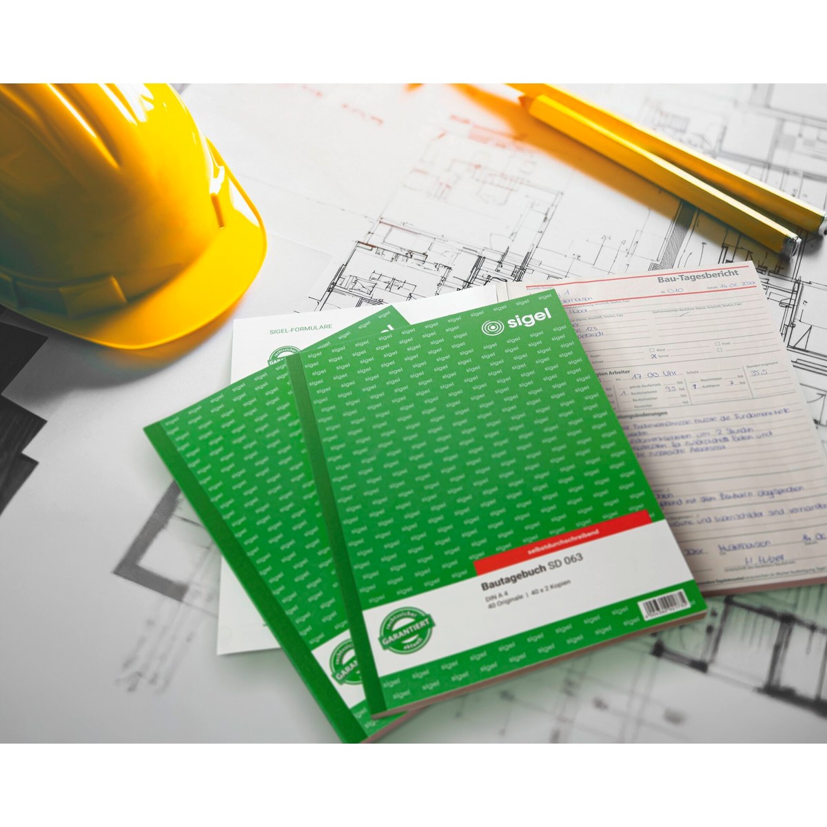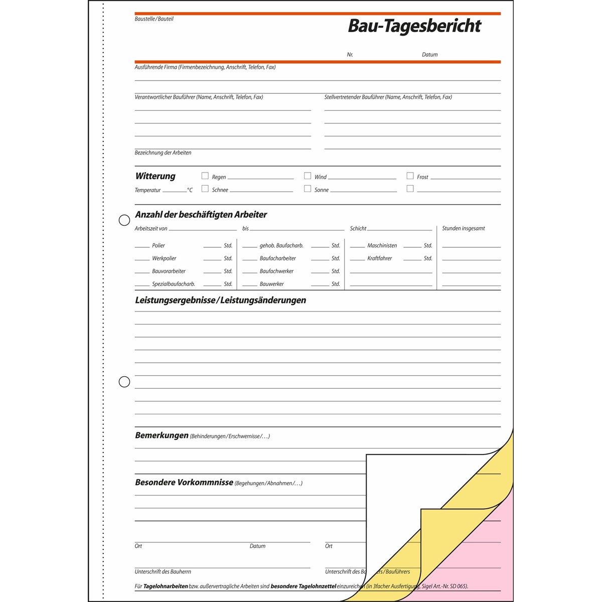 Selbstdurchschreibendes, praxisbewährtes Bautagebuch mit 2 farbigen Kopien (gelb, rosa), Format A4, für den genauen Nachweis ausgeführter Bauleistungen.