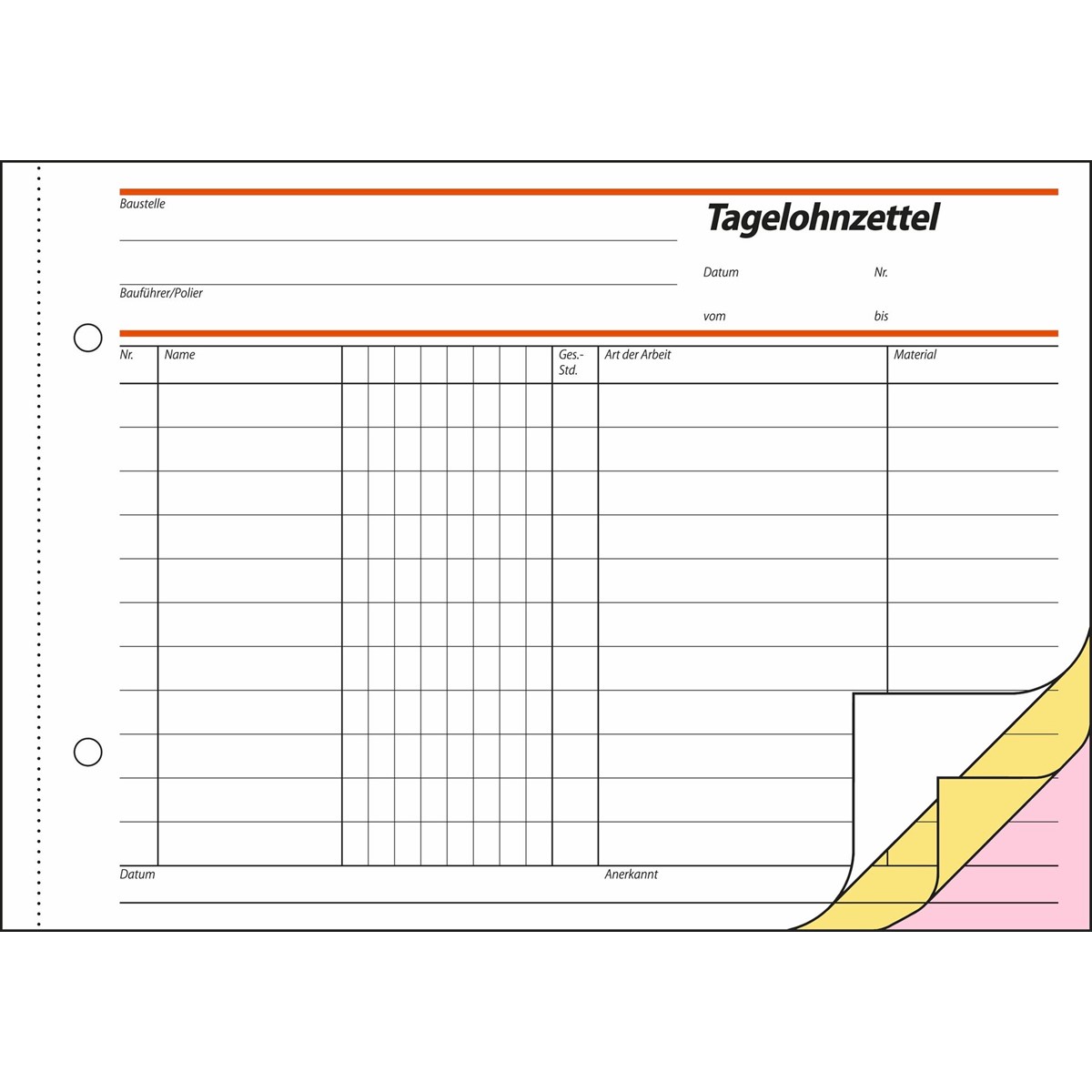 Selbstdurchschreibende Tagelohnzettel mit je zwei farbigen Kopien (gelb, rosa), Format A5 quer, für den genauen Nachweis der Tagesleistung.
