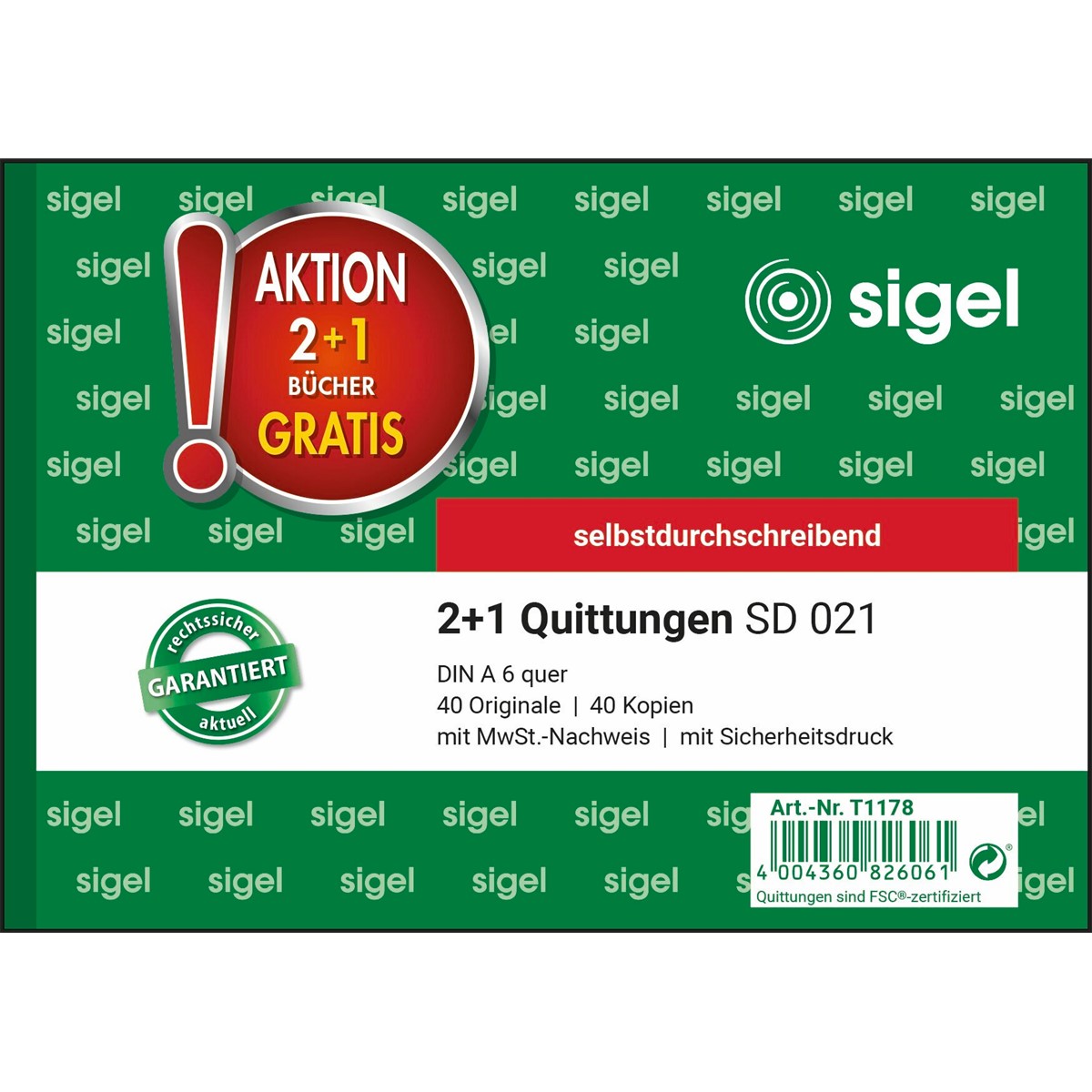 2+1 (gratis) Aktion mit selbstdurchschreibendem Quittungsformular SD021. Format DIN A6 quer, je Buch mit 40 Originalen + 40 gelben Kopien, inklusive integrierter Schreibunterlage. FSC® zertifiziert, aktuell und rechtssicher, mit MwSt.-Nachweis und fälschungssicherem Dokumentendruck auf jedem Originalblatt. Alle Blätter mit Abheftlochung und ultrafeiner Microperforation für ein leichtes und sauberes Heraustrennen. Formularbuch mit besonders haltbarer Sicherheitsbindung. Im Lieferumfang sind 3 Bücher in der Folienpackung enthalten.