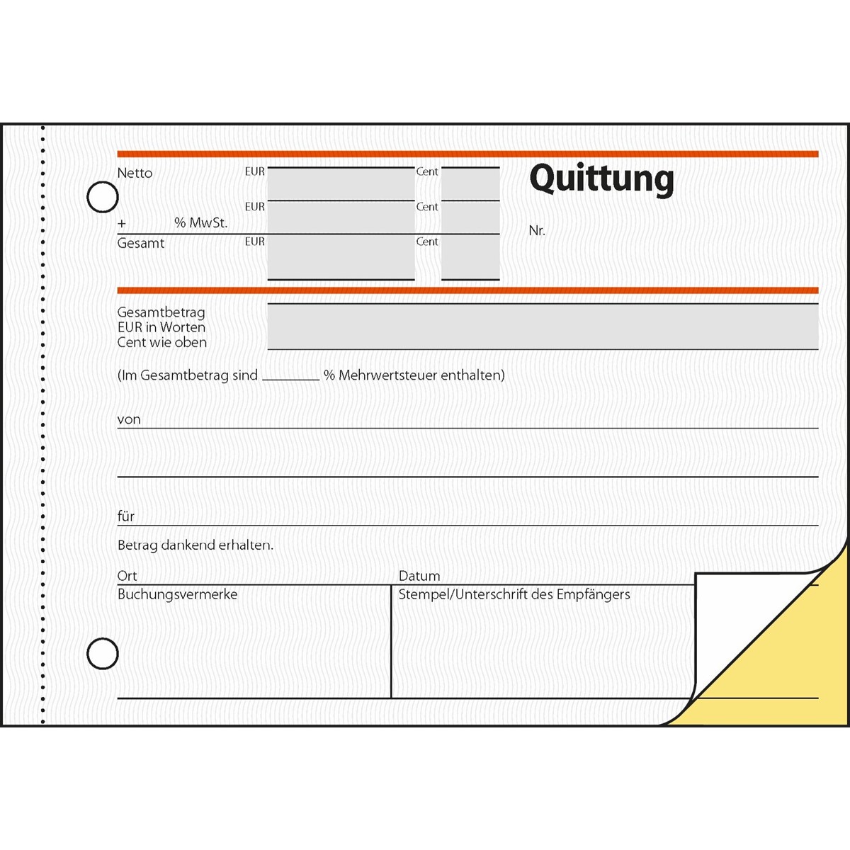 Selbstdurchschreibendes Quittungs-Formular, Format A6 quer, mit MwSt.-Nachweis, 1. und 2. Blatt bedruckt
