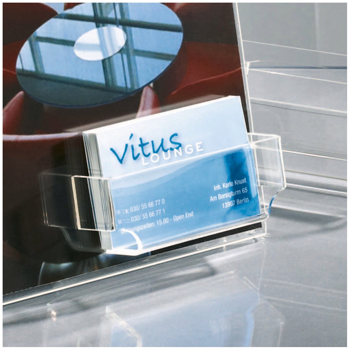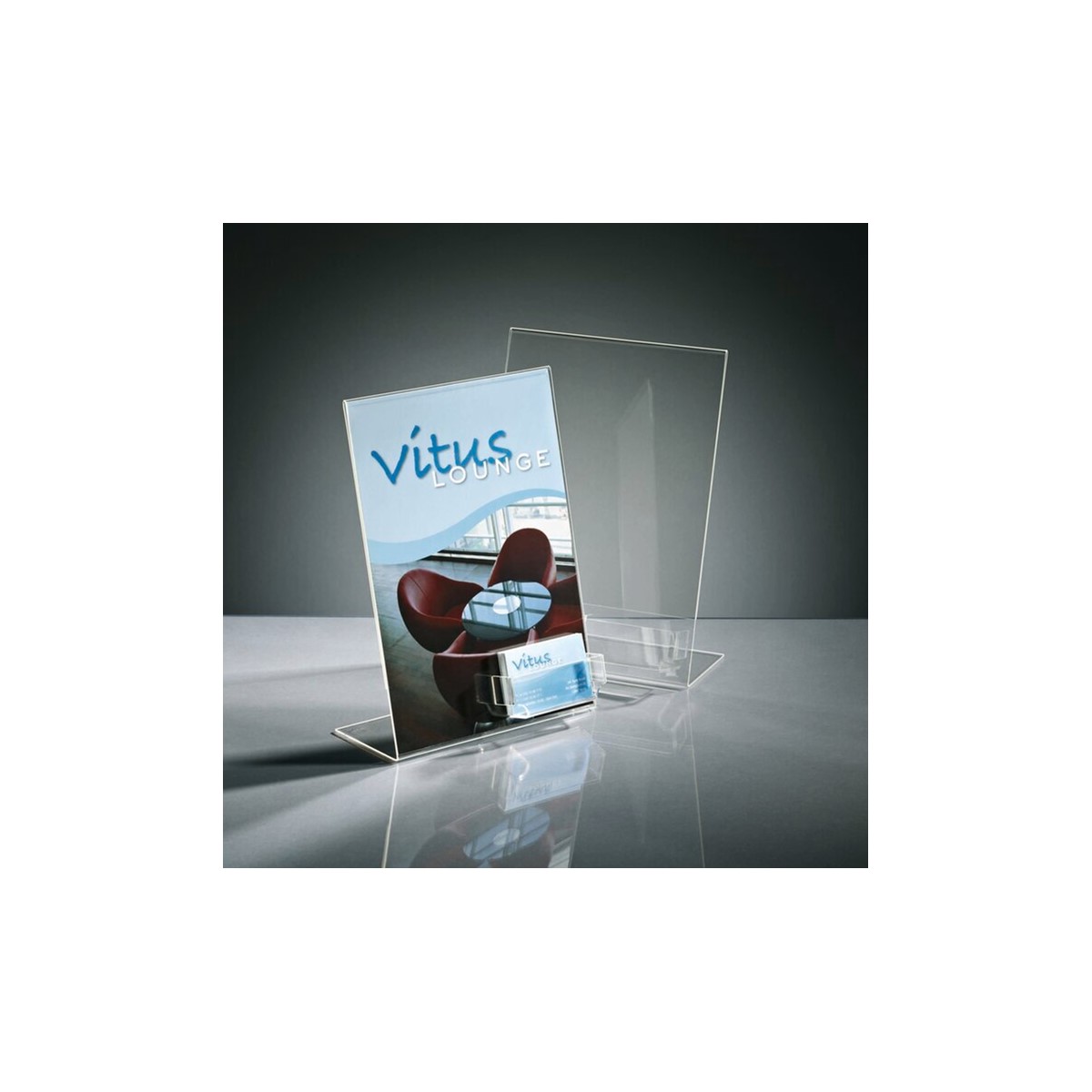 Schräger Tischaufsteller zur einseitigen Präsentation von beispielsweise Aktionen, Hinweisen oder Angeboten in der Größe DIN A4 mit einem Zusatzfach für Visitenkarten. Für Theken, Tische, Ausstellungsräume und Messen. Hochwertiges, glasklares 1,8 mm starkes Acryl mit polierten, glatten Kanten für hohe Stabilität und Standfestigkeit. 25 Jahre Garantie auf die UV-Beständigkeit des Acryls. Die Außenmaße des Tischaufstellers betragen 210 x 300 x 125 mm (B x H x T).