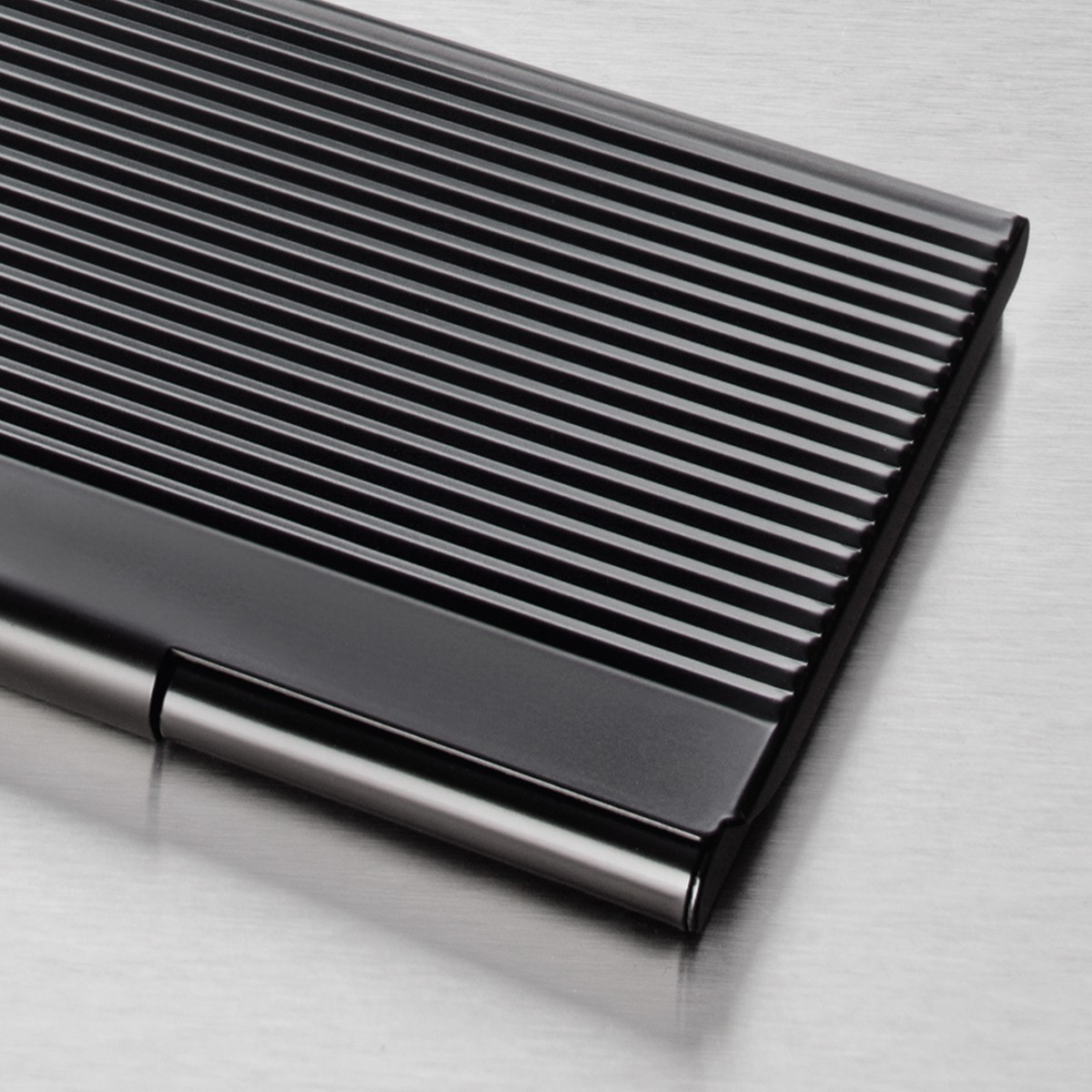 Edles, matt-schwarzes Visitenkarten-Etui aus hochwertigem Metall zur sicheren Aufbewahrung und zum optimalen Schutz von Karten. Haptisch erfahrbare, gerillte Oberfläche. In das Etui passen bis zu 20 Karten (max. 91 x 56 mm). Die Außenmaße betragen 95 x 62 x 7 mm (B x H x T).