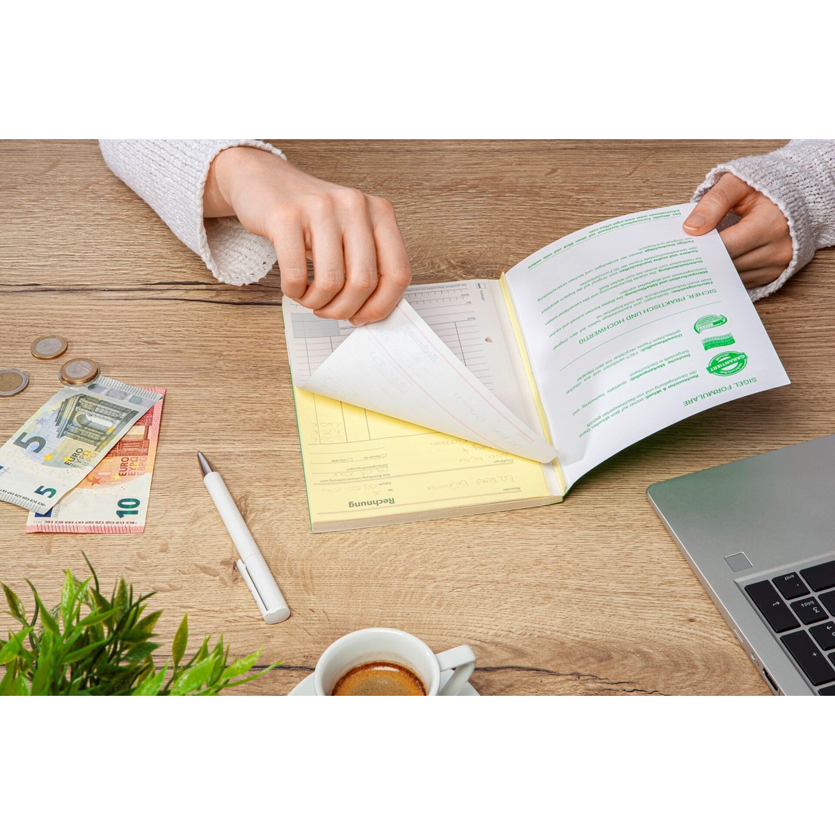 Stets auf dem aktuellen Stand der Gesetzgebung: Rechnungen, A5, 2x 30 Blatt, FSC-zertifiziert. Trotz E-Rechnungspflicht seit 01.01.2025: Rechnungsformulare in Papierform bleiben gültig.