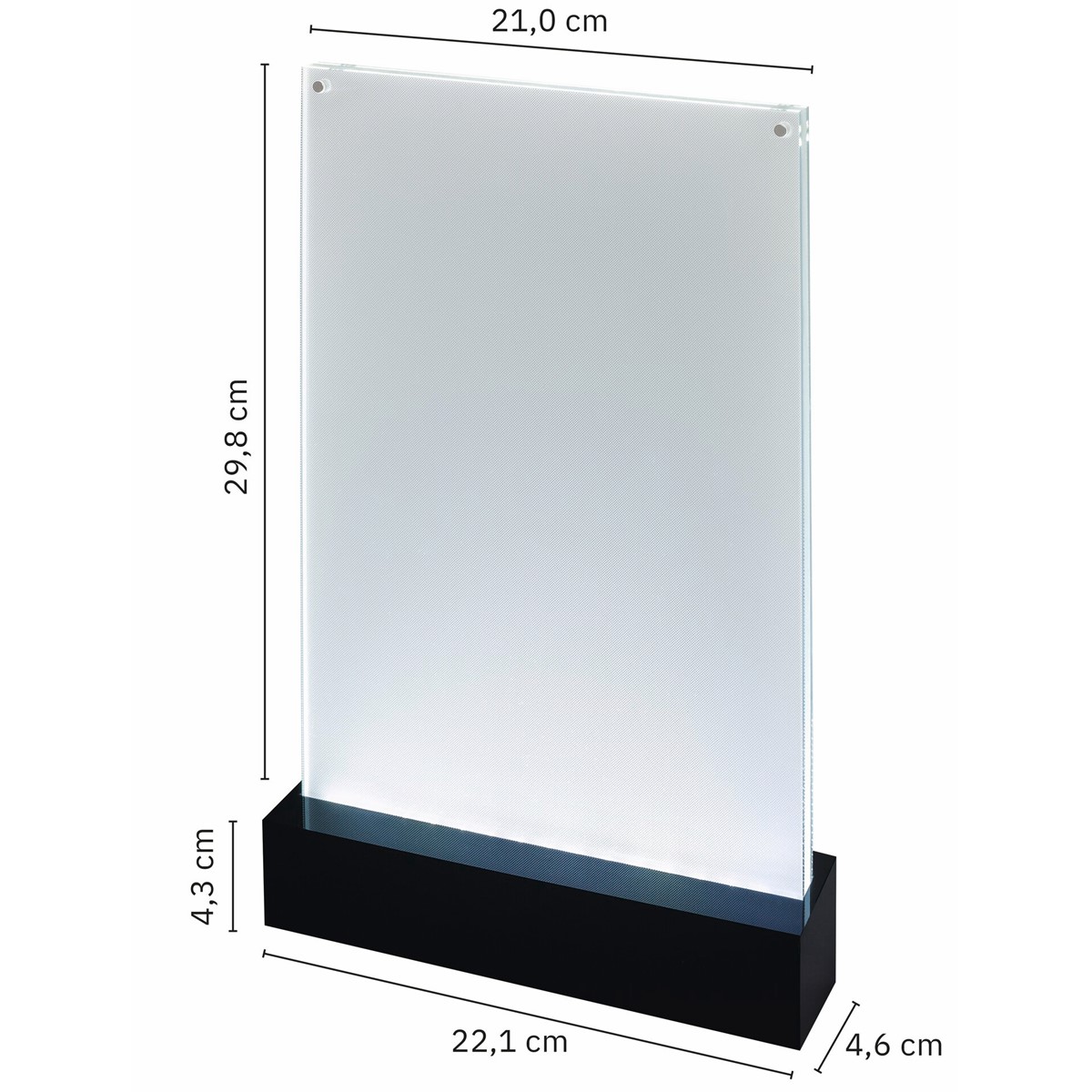 - Gerader LED-Tischaufsteller „luminous“ (22,1 x 34,1 x 4,6 cm) für Einleger im Format A4 (80-350 g/m²) setzt Informationen und Angebote beleuchtet in Szene