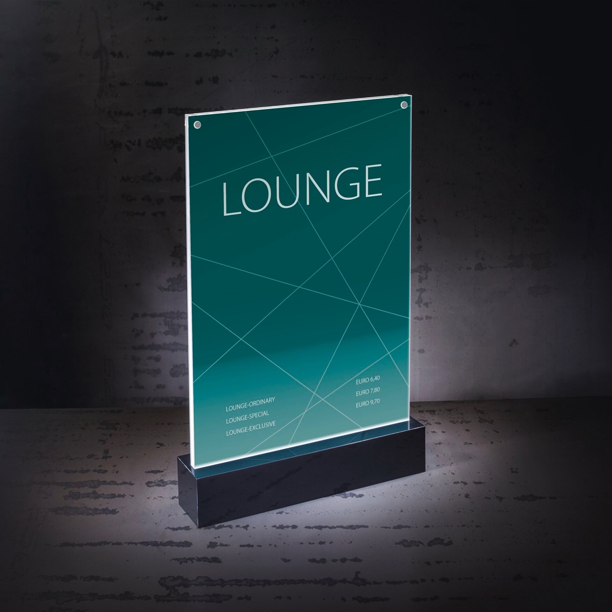 Der LED-Tischaufsteller „luminous“ lenkt die Aufmerksamkeit von Gästen und Besuchern auf Ihr Angebot. Dabei setzt die Beleuchtung im Sockel Ihre Information attraktiv in Szene.