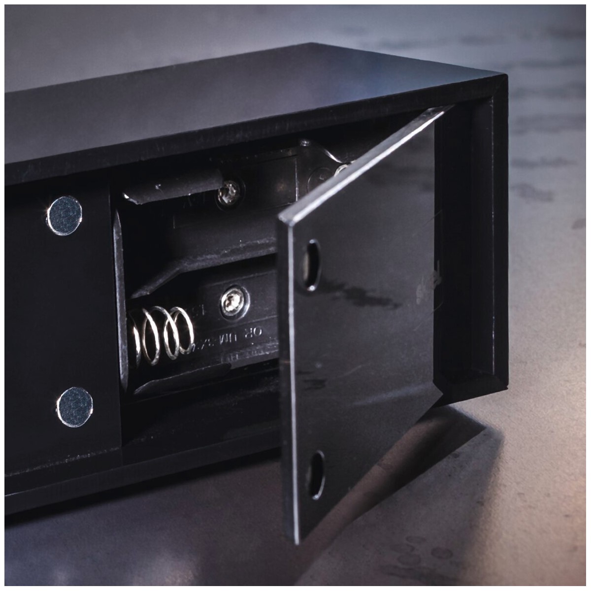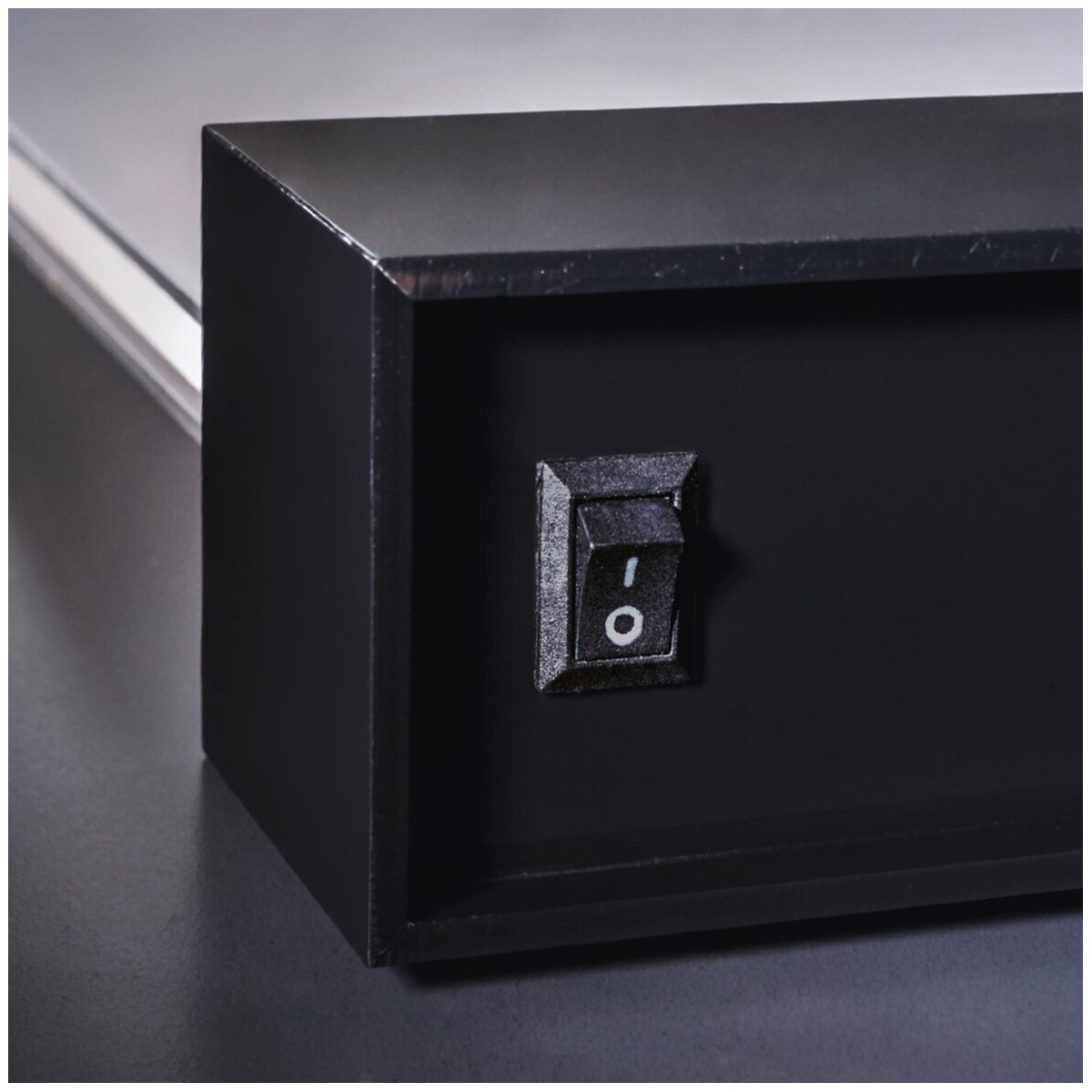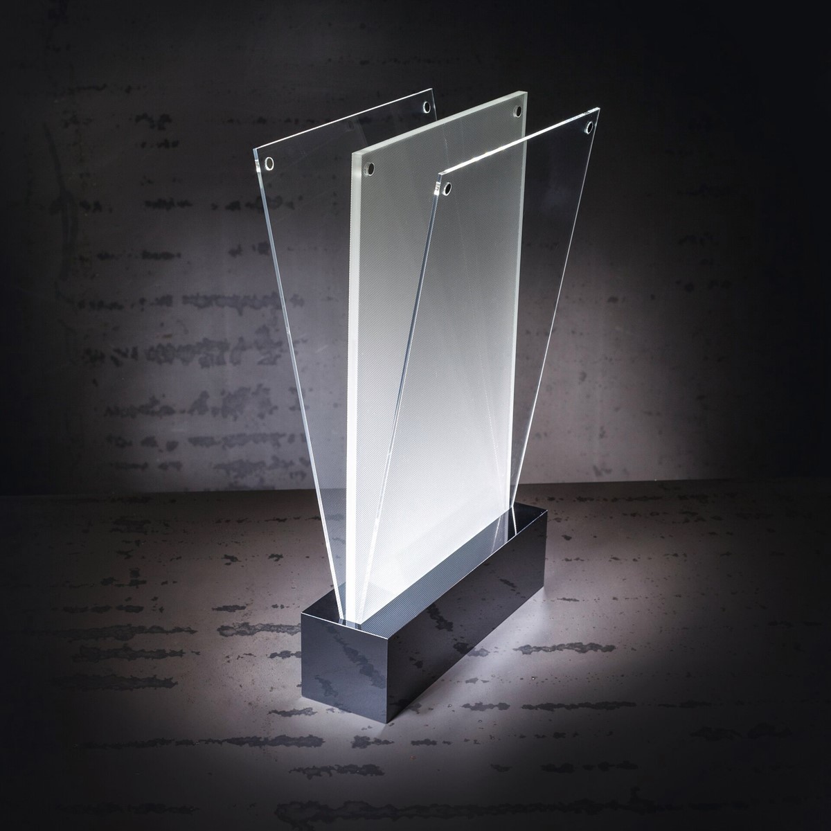 • Besteht aus 3 transparenten Acryl-Scheiben (davon 2 aufklappbar), die durch Magnete gehalten werden, einem schwarzen, glänzenden Acryl-Sockel mit integrierten LEDs und einem Kipp-Schalter an der Unterseite