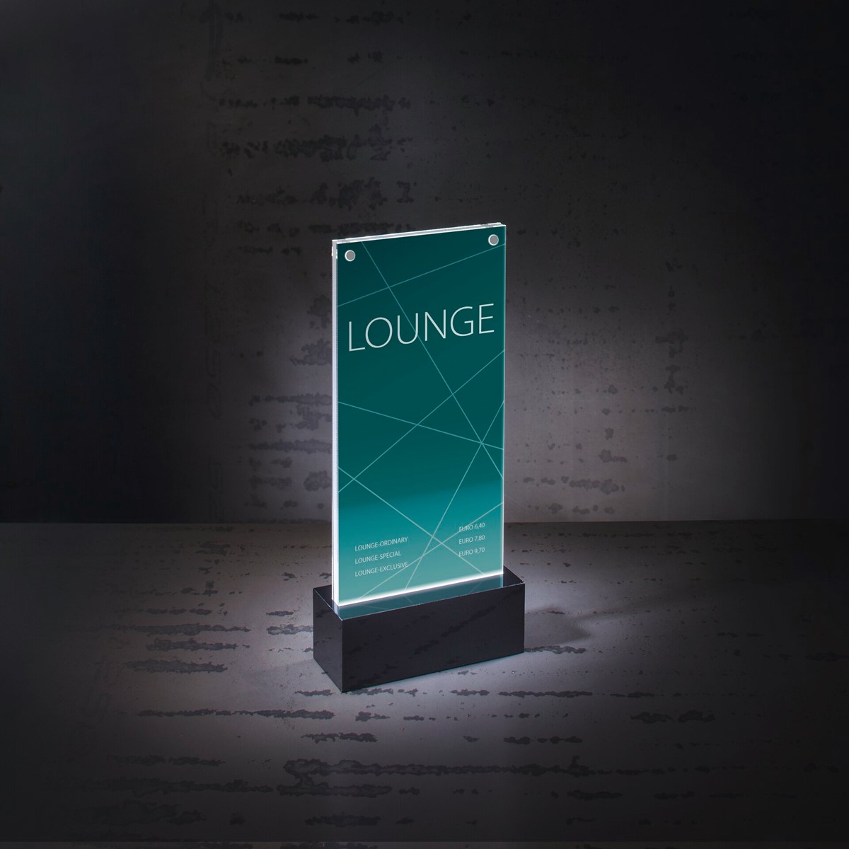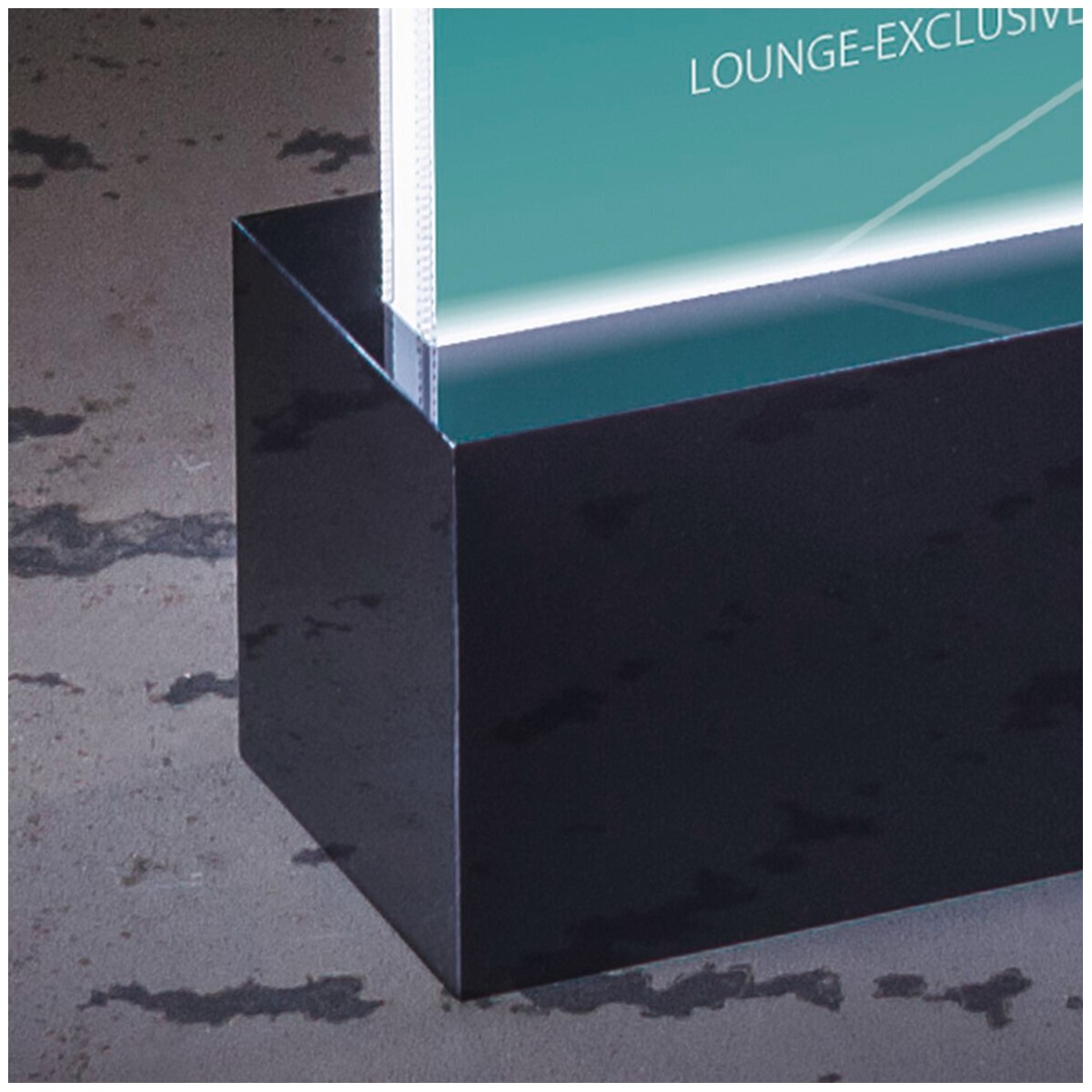 Der LED-Tischaufsteller „luminous“ lenkt die Aufmerksamkeit von Gästen und Besuchern auf Ihr Angebot. Dabei setzt die Beleuchtung im Sockel Ihre Information attraktiv in Szene.