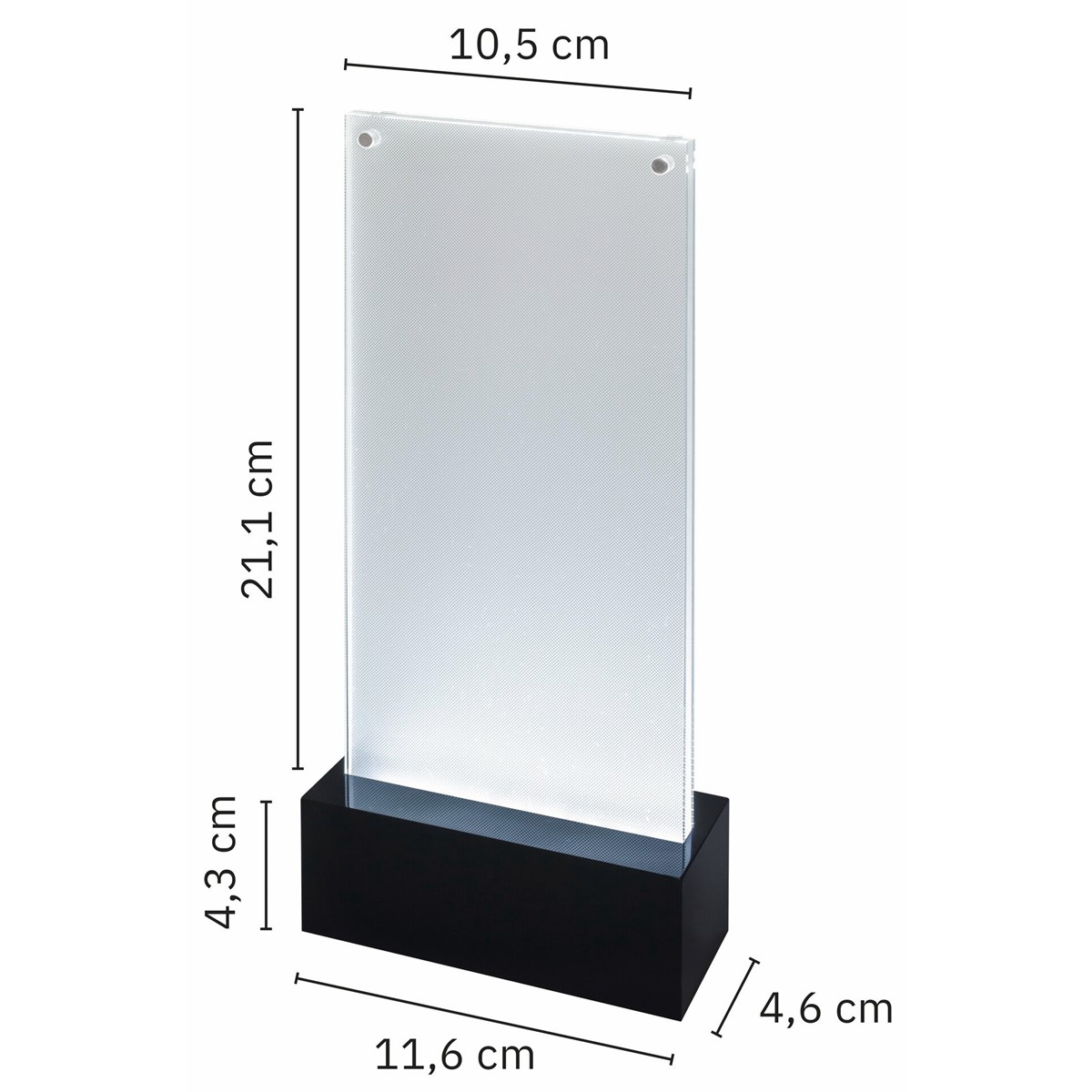 Die im Sockel integrierten LEDs beleuchten die Einleger, die auf beiden Seiten eingesteckt werden können, mit modernem, Tageslicht ähnlichem Licht.