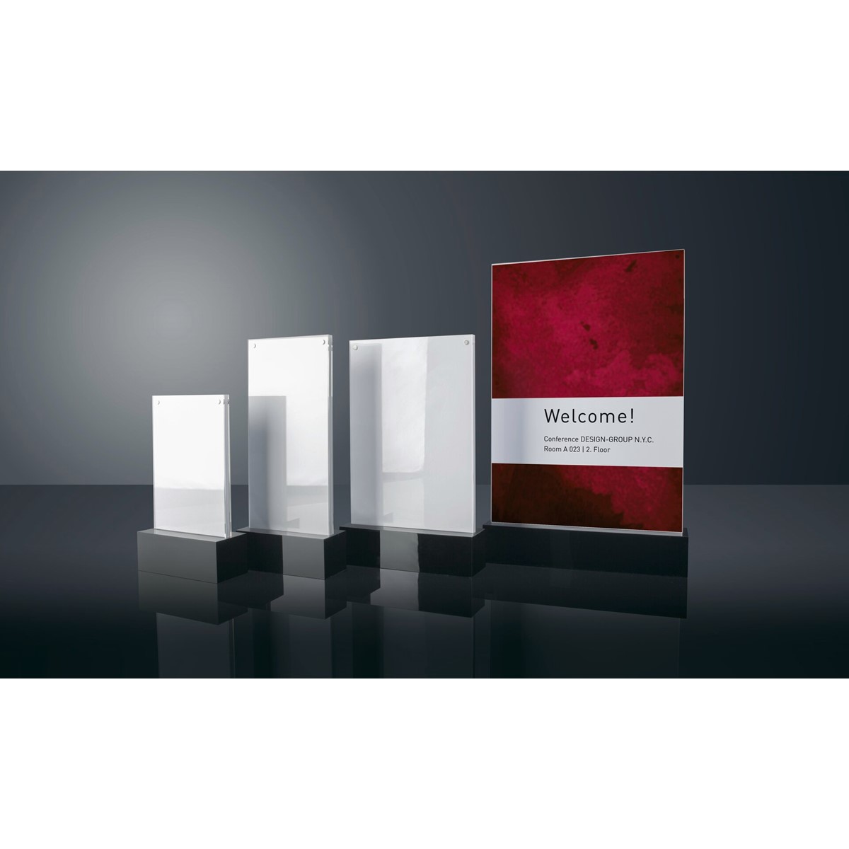 Der hochwertige Design-Tischaufsteller für Einleger im Format DIN lang besteht aus einem puristischen schwarzen Sockel aus glänzendem Acryl und zwei aufklappbaren, transparenten Acryl-Scheiben, die mithilfe kleiner Magnete zusammengehalten werden.