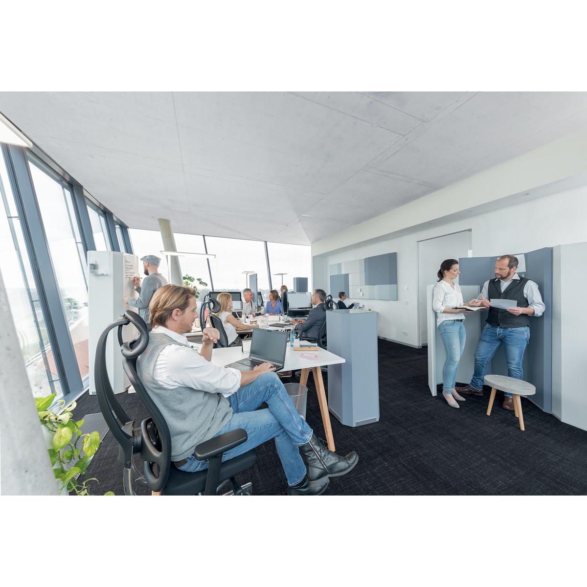 Akustik-Raumtrenner Sound Balance in Dunkelgrau, 1 Stück. Für Ihren effektiven Schallschutz im Büro: Der Akustik-Raumtrenner ist ein leistungsfähiger Schallabsorber zur Verbesserung der Raumakustik in Ihrem Mehrpersonenbüro. Das frei stehende Raumelement absorbiert den Schall, reduziert den Schallpegel bzw. Nachhall im Raum und verringert damit effektiv den Einfluss von Störgeräuschen auf das tägliche Arbeiten. Garantiert gut: Die Akustik-Stellwand hat eine nachgewiesen hohe akustische Wirksamkeit und erfüllt die Schallabsorberklasse B (bewerteter Schallabsorptionsgrad αw nach DIN EN ISO 11654 = 0,80; d. h., 80 % des auftreffenden Schalls werden absorbiert). Die akustische Performance ist durch das unabhängige Akustikinstitut Müller-BBM geprüft und zertifiziert. Der Akustik-Raumtrenner erfüllt hohe Designansprüche an die Innenausstattung: Das formschön geschwungene Element im Curved Design ist ein Hingucker in jedem Büro. Zur Auswahl stehen zwei dezente Farben und zwei aufeinander abgestimmte Formate, die sich in Kombination miteinander optimal zur Strukturierung bzw. Zonierung von Büroflächen eignen. Zudem harmonieren die Raumtrenner mit beliebigen Akustik-Produkten aus der Serie Sound Balance, um Ihren Büroräumen ganz flexibel eine individuelle Designlinie zu verleihen. Schnell und einfach montiert: Mit dem vormontierten Standfuß aus matt eloxiertem Aluminium wird der Mittelteil des Raumtrenners sicher und stabil aufgestellt, und die zwei Seitenteile werden mit einer einfachen Schiebeverbindung daran befestigt.