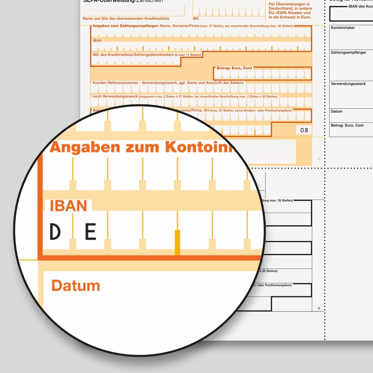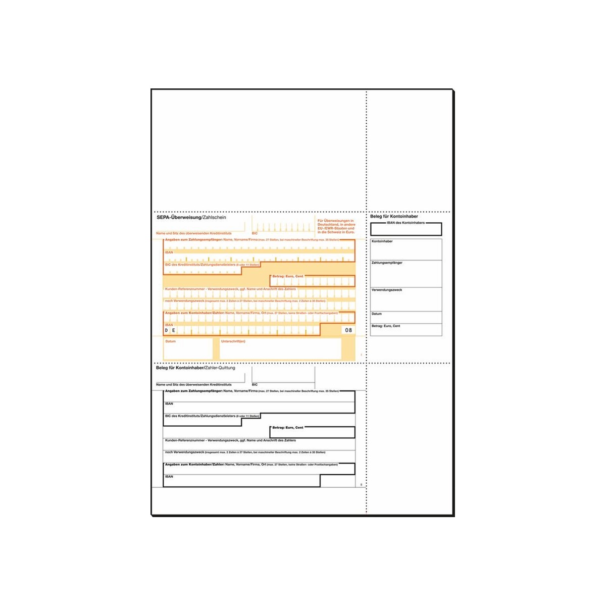 PC-SEPA-Überweisung/Zahlschein zum Ausfüllen mit PC und Drucker. Für Überweisungen in Deutschland, in andere EU-/EWR-Staaten und in die Schweiz in Euro. Gültig für alle Banken und Sparkassen. Beleglesefähiges OCR-Spezialpapier in 90 g/m², geeignet für alle Inkjet- und Laser-Drucker. Die ultrafeine Microperforation sorgt für leichtes Abtrennen der Formulare und exakte Kanten. Im Lieferumfang sind 100 Blatt im Format DIN A4 enthalten.