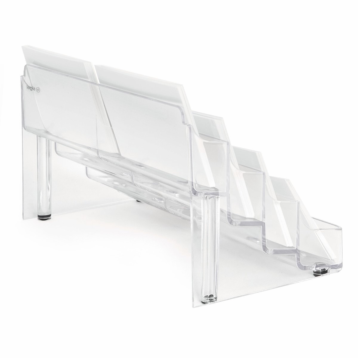 Glasklarer Visitenkarten-Aufsteller mit 8 Fächern aus Hartplastik zur besonders platzsparenden Präsentation und schnellen Entnahme von verschiedenen Visitenkarten. Dank transparenter Gummifüße standfest und rutschsicher. Pro Fach passen bis zu 70 Karten (max. 94 x 85 mm) in den Aufsteller, insgesamt bis zu 560 Karten.