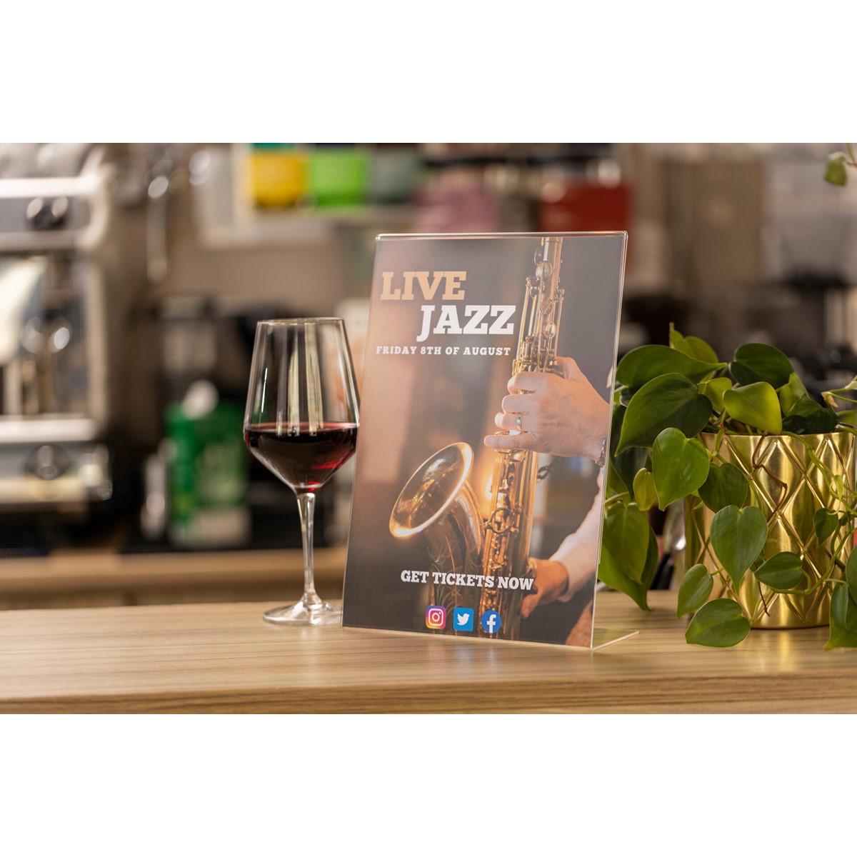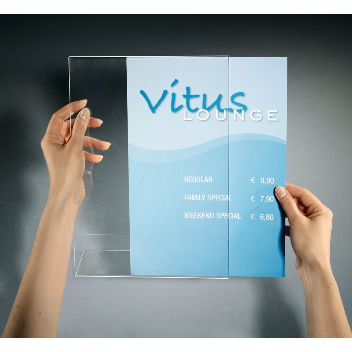 Der Tischaufsteller von SIGEL setzt Informationen perfekt in Szene und ist ein attraktiver Blickfang auf Theken, Tischen, Messen und in Ausstellungsräumen.
