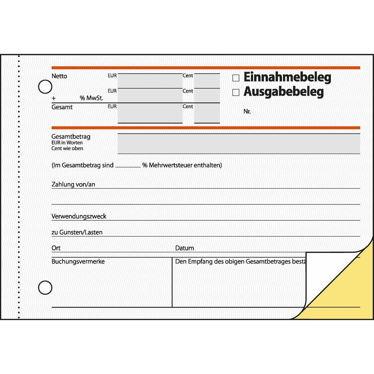 Selbstdurchschreibender Ausgabe- / Einnahmebeleg im Format DIN A6 quer mit 40 Originalen + 40 gelben Kopien.