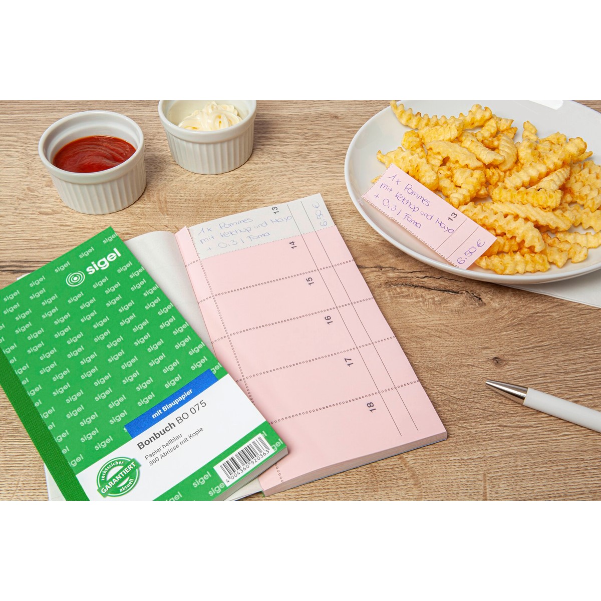 Selbstdurchschreibendes Bonbuch mit 2 x 60 Blatt (= 360 Abrisse) und integrierter Schreibunterlage. FSC® zertifiziert, Originalbon in gelb, mit fortlaufender Nummerierung. Alle Blätter mit einer Schnitt-Steg-Perforation für ein schnelles und sauberes Heraustrennen der Abrisse. Eine Sicherheitsbindung macht das Formularbuch besonders stabil und haltbar. Vielseitig einsetzbar z.B. als Kuchen- oder Getränkebon.