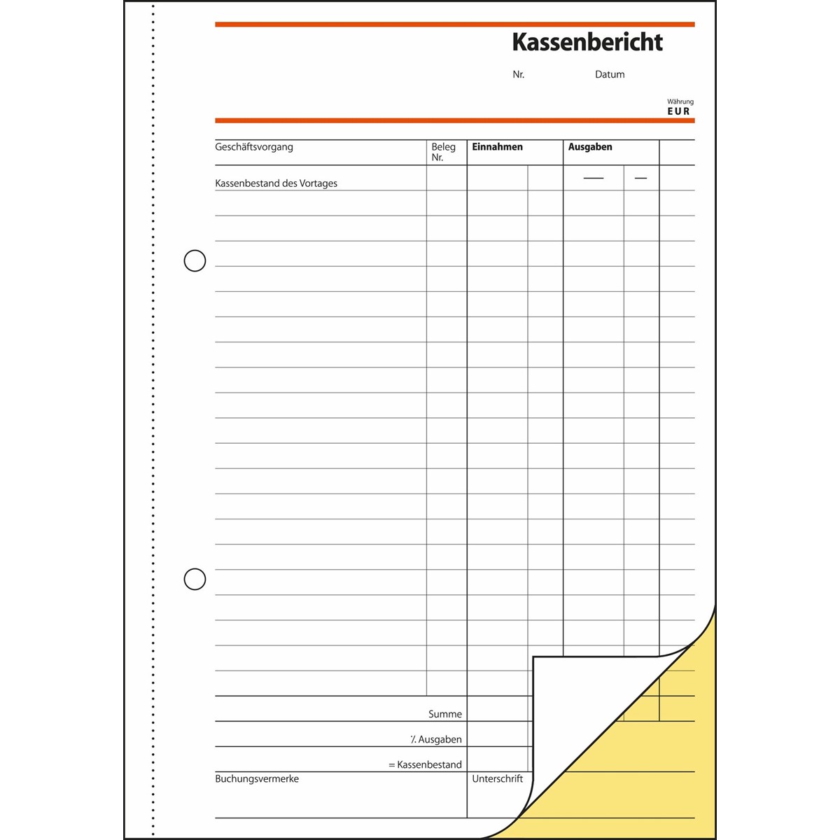 Selbstdurchschreibender Kassenbericht/ Bestandsrechnung mit farbiger Kopie (gelb), Format A5, für die korrekte Ermittlung des Tagesabschlusses und des Kassenbestandes.