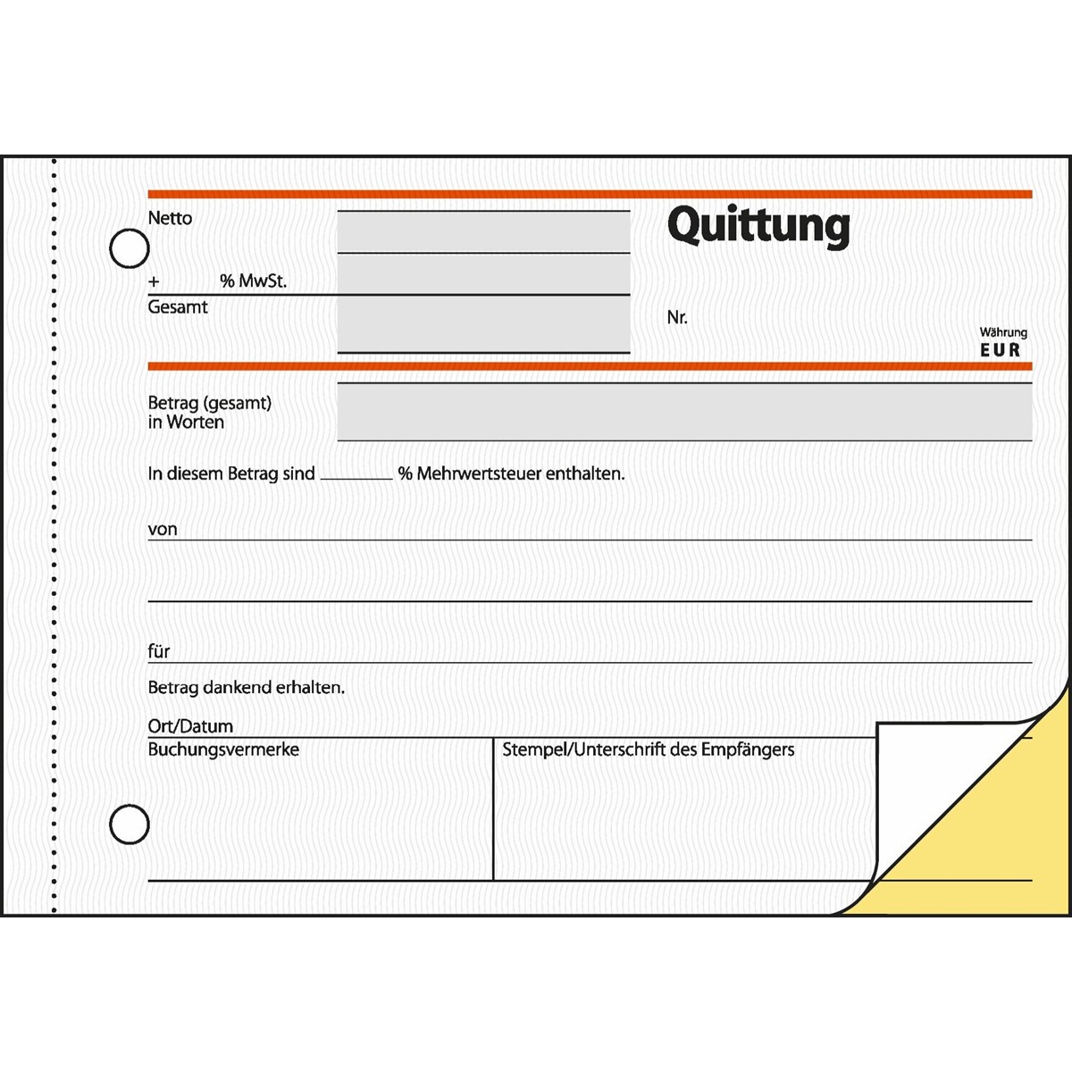 Selbstdurchschreibendes Quittungs-Formular, Format A6 quer, mit MwSt.-Nachweis.