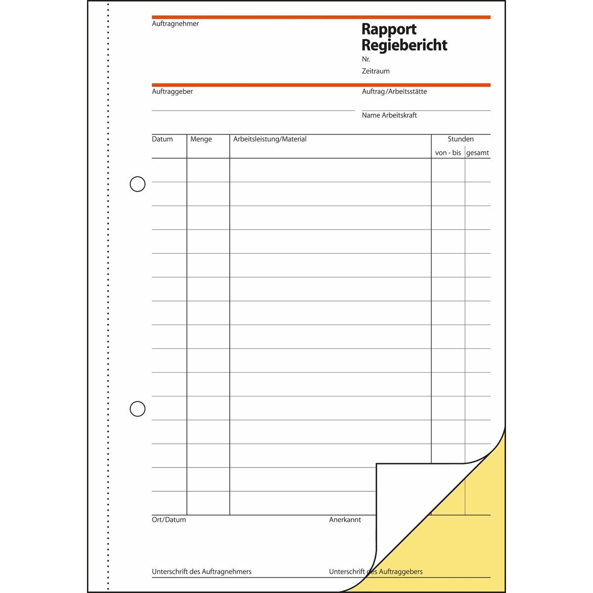 Selbstdurchschreibendes Rapport-Formular zur Erfassung des Regieberichtes mit Aufschlüsselung in Arbeitsleistung, Material und Arbeitszeit, Format A5.