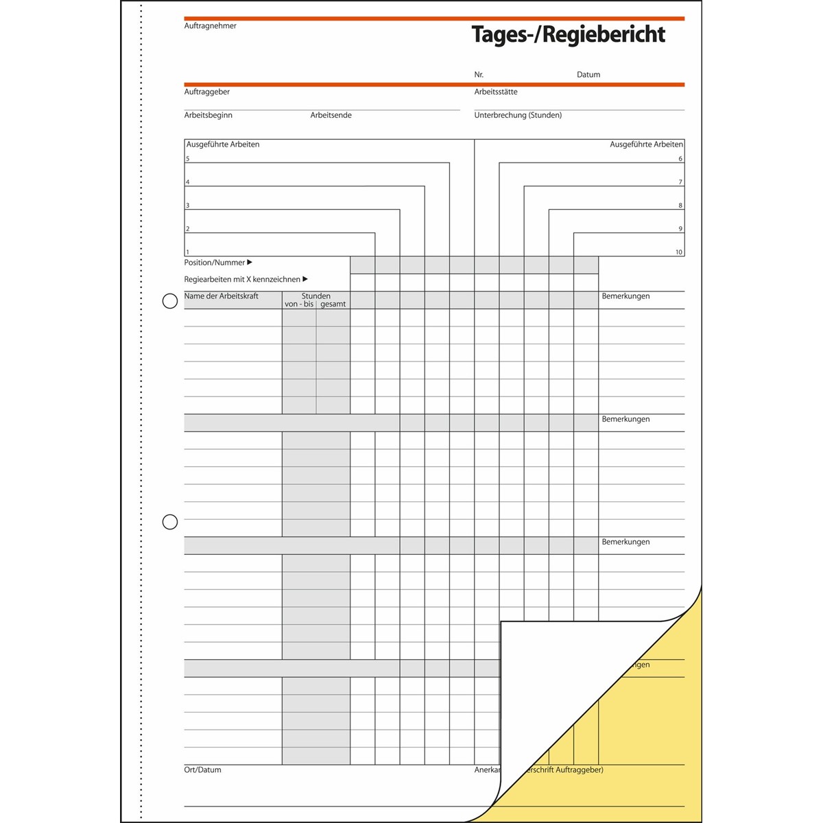 Selbstdurchschreibender Tages-/Regiebericht im Format DIN A4 mit 40 Originalen + 40 gelben Kopien