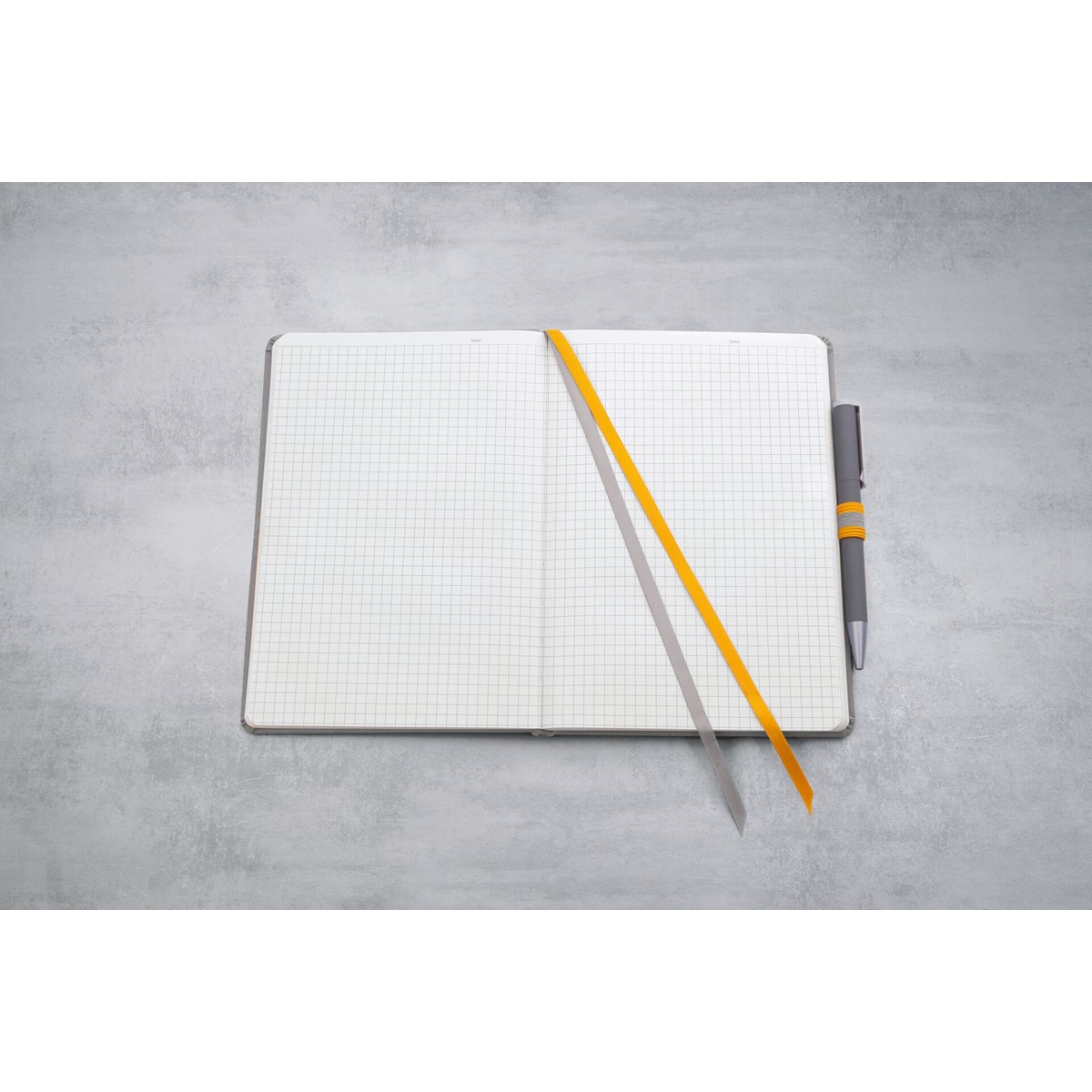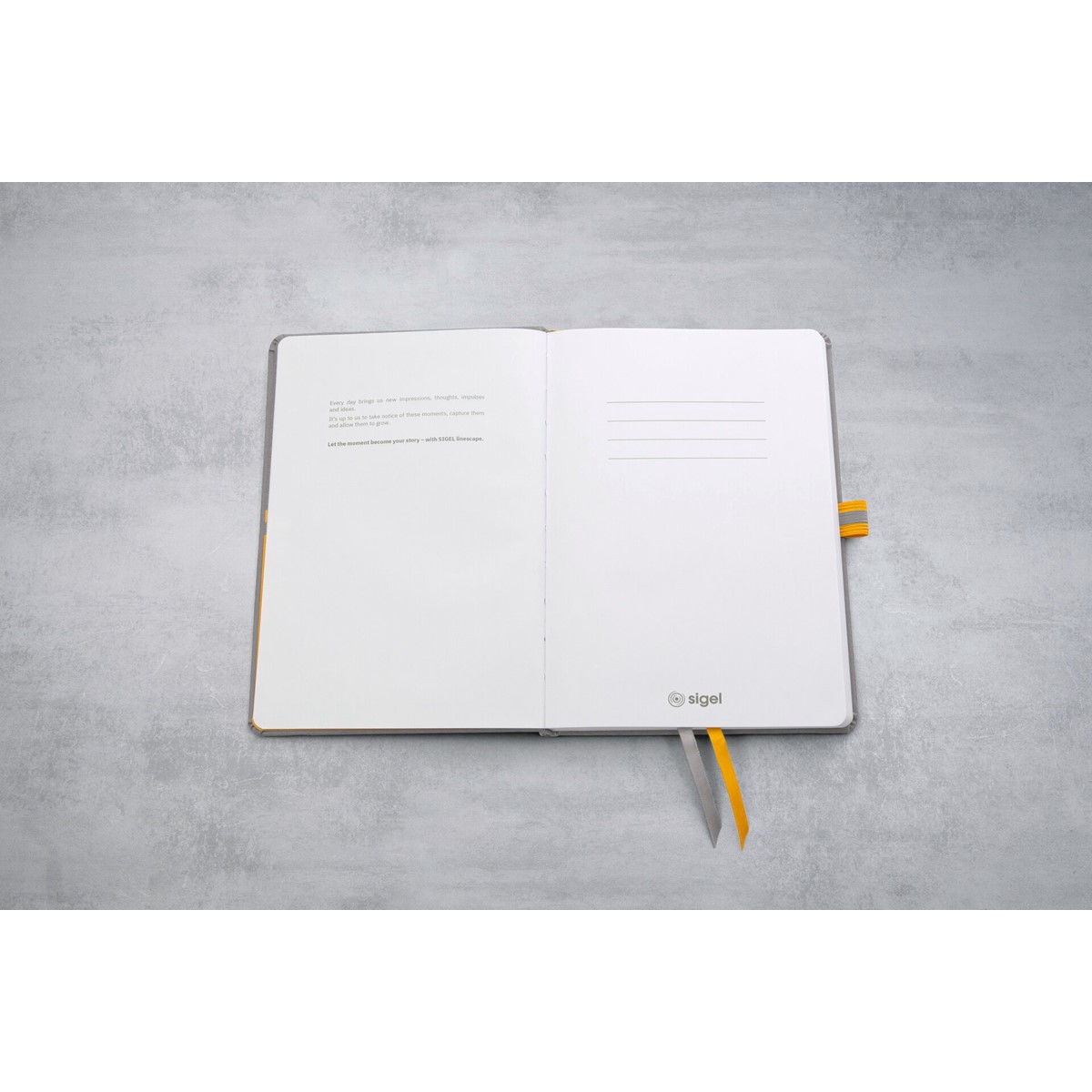 Das Cover aus weichem PU kommt dabei dezent in Grau, allerdings besticht die Akzentfarbe Gelb bei den Features: Gummiband, Zeichenbänder, die 2-farbige Stiftschlaufe und die Vorsatzseiten greifen den Gelbton wieder auf.