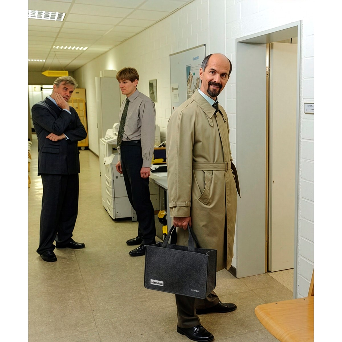 • Maße: 36 x 28 x 15 cm – das sind nicht die Maße von Strombergs Bauch, aber nah dran. Platz für Laptops bis 15,4 Zoll. Aus 100 Prozent recyceltem PET – also Müll, aber in schick. Dunkelgrau mit grauen Nähten, wie Strombergs Anzug: seriös, aber irgendwie traurig